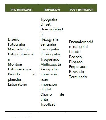 Este ciclo de generación, fabricación y venta de materiales impresos, da lugar al encadenamiento productivo que origina procesos de manufactura: pre-impresión (pre-prensa), impresión (prensa) y post-impresión (post-prensa) que configuran la “tercerización” de la producción industrial (Perdomo, Malaver, Rojas, & Vega, 2002). La tabla 1 muestra en detalle la composición de actividades de cada subproceso de las empresas del sector.