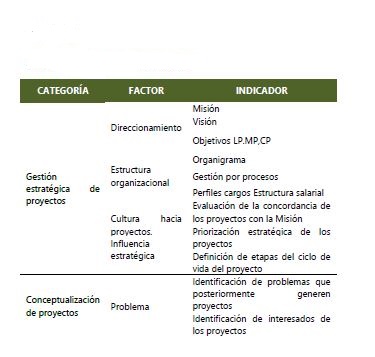 Identificación de factores de análisis de madurez en proyectos. Tras una revisión de los modelos OPM3, P3M3 y CP3M, se identifican cinco categorías temáticas como eje central de la madurez de la gerencia de proyectos en las organizaciones. Estas categorías son: