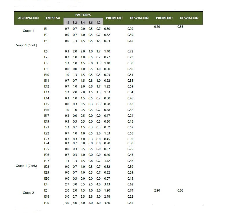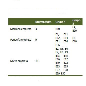 Se identificaron dos grupos, el primero incluyó 26 empresas con un menor nivel de desarrollo, de las cuales 1 es mediana, 7 son pequeñas y 18 son micro empresas (Tabla 8), y el segundo grupo incluyó 4 empresas con mayor nivel de desarrollo; 2 medianas (empresas codificadas como E4 y E20) y 2 pequeñas (codificadas como E5 y E18).