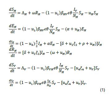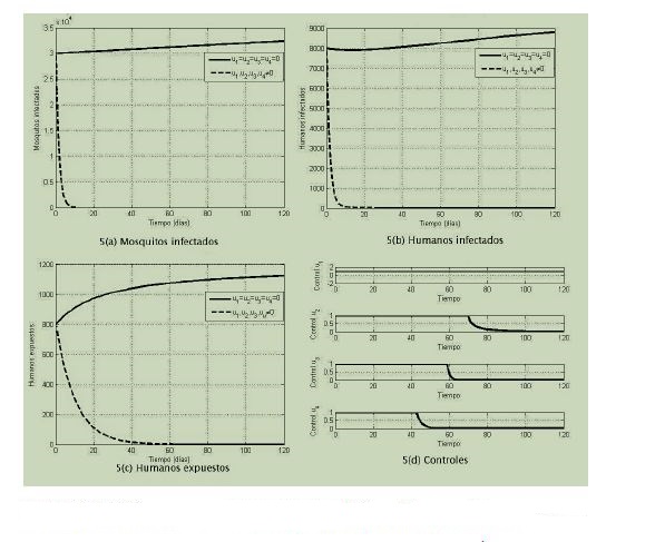El primer objetivo fue minimizar el índice de rendimiento o función de costo por el uso de las cuatro variables de control descritas anteriormente. Las hipótesis sobre las cuales se formula el modelo matemático son las siguientes: para la población humana el modelo matemático es tipo SEIR; mientras que para la población de mosquitos el modelo es tipo SI. Por otro lado, la población de humanos susceptibles pasa a ser expuesta por contacto con mosquitos infectados a una tasa , donde u1 es la variable de control por uso de toldillos, la cual asume valores entre 0 y 1, donde u1= 0 es asumido si el uso de toldillos es no eficaz y u1 = 1 si el uso de toldillos es completamente eficaz, es decir, no hay infección.