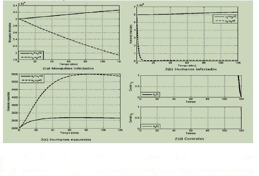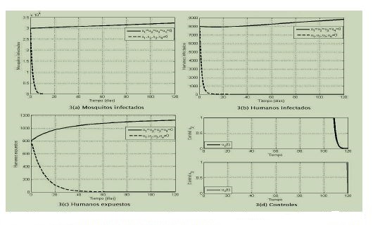 Para zonas de transmisión baja, el comportamiento de las poblaciones de mosquitos infectados y humanos infectados fue similar que en zonas de transmisión alta, con el uso de los controles la población de humanos expuestos crece 18% más que sin el uso de controles (Figura 3(a) y 3(b)). En la Figura 3(c), Figura 3(d) se observa que el comportamiento de los controles y es similar al comportamiento en zonas de transmisión alta. El costo máximo alcanzado por la implementación de la estrategia fue de 4.75.