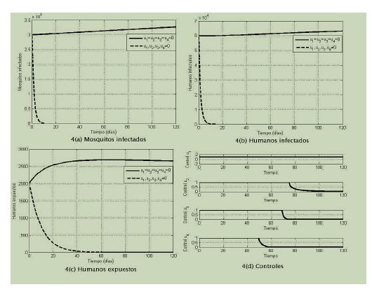En la Figura 4 (d) se pudo observar el comportamiento de los controles durante los 120 días de implementación de la estrategia. El control u_1 se mantiene en su cota superior de 100% durante el periodo total de implementación de la estrategia; los controles u_2 y u_3 alcanzan y se mantienen en la cota superior de 100% durante los 75 primeros días de implementación de la estrategia, y después decrecen gradualmente hasta alcanzar su cota inferior de 0% en el día 90; el control u_4 alcanza y se mantiene en la cota superior de 100% durante los 50 primeros días de implementación de la estrategia, en seguida decrece hasta alcanzar su cota inferior de 0% en el día 57 y se mantiene en cero durante los 63 días restantes.