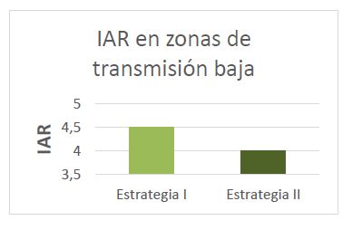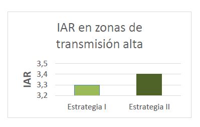 En la Figura 6 se compararon los IAR de cada estrategia de control en zonas de transmisión alta y baja de Tumaco, de la cual se observa que la estrategia más costo-efectiva en términos de IAR y el costo total de la intervención, es la estrategia II para zonas de transmisión alta, y la estrategia I para zonas de transmisión baja. No obstante, para más claridad, se examinan los ICER de cada estrategia en cada zona y después se dan conclusiones.