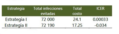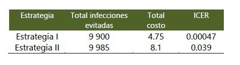 Este índice fue calculado dividiendo el costo neto de la intervención por el número total de infecciones prevenidas con la intervención; 2) Índice marginal de costo-efectividad (MCER), el cual se usa para evaluar los cambios específicos en el costo y efectividad cuando un programa es expandido o contraído; y 3) Índice incremental de costo-efectividad (ICER), el cual es usado para comparar las diferencias entre el costo y los efectos de salud de dos estrategias alternativas de control que compiten por los mismos resultados, y se describe como el costo adicional por resultado de salud adicional.