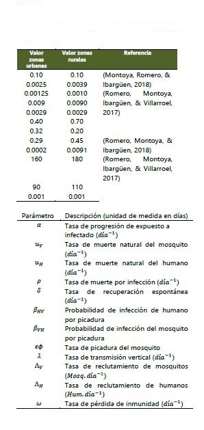 Una interpretación de todos los parámetros del modelo (1) y sus valores asumidos tanto en zonas rurales como en urbanas de Tumaco (Tabla 1), y el diagrama compartimental del sistema de ecuaciones diferenciales (Figura 1).