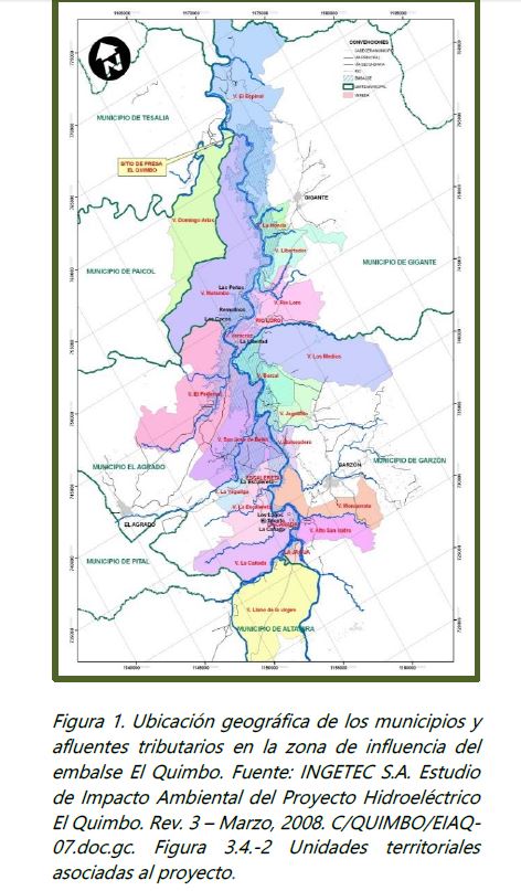 Área de Influencia Indirecta (AII)[10]: comprende la cuenca tributaria directa del embalse, que incluye las microcuencas de las quebradas, por la margen izquierda: Los Cocos, Las Guaduas, El Cedro, El Hueco, Zanjón el Alto, El Pedroso, Zanjón Algarrobo, Zanjón La Cascajosa, El Granadillo, La Turbia, Zanjón de la Mosca, Quebrada El Limón hasta la cota 900 msnm, Quebrada Yaguilga hasta la cota 800 msnm, Zanjón El Altillo, Quebrada La Seca hasta la cota 800 msnm, Zanjón El Palmar, El Río Magdalena hasta la confluencia con la Quebrada Lagunillas hasta la cota 800 msnm y el Río Páez hasta la confluencia con la Quebrada El Espinal; por la margen derecha: El Río Suaza hasta la cota 800 msnm, la Quebrada Aguacaliente hasta la cota 1000 msnm, Quebrada Las Damas, La Quebrada de Garzón, La Quebrada de Majo, Quebrada Jaquillo, Quebrada Voltezuela, Ríoloro hasta la cota 1000 msnm, La Quebrada Alonso Sánchez hasta la cota 1000 msnm, El Zanjón de la Barrialosa, La Quebrada La Honda hasta la cota 1000 msnm, la Quebrada Guandinosa hasta la cota 1000 msnm y una franja de 500 metros a lado y lado del Río Magdalena, desde el sitio de presa hasta la Quebrada Puerto Seco (Figura 1).