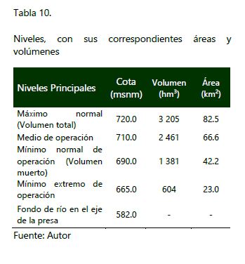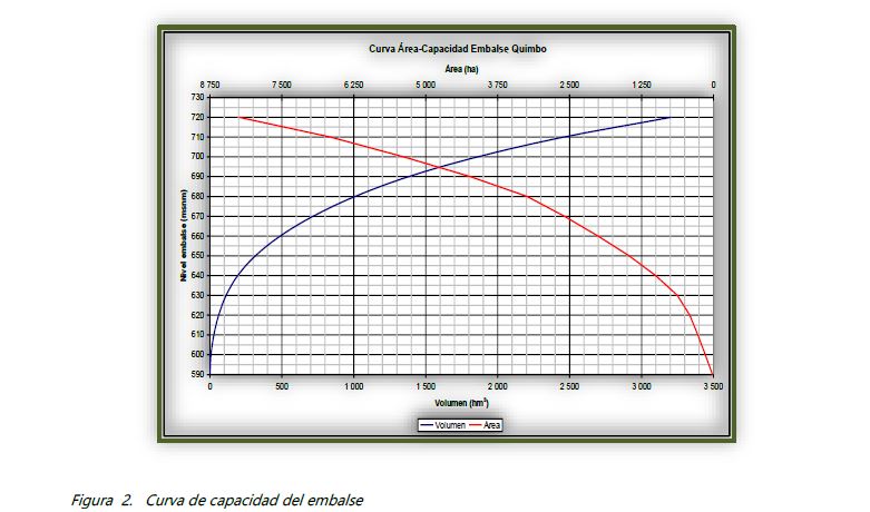 Además, se consideró una profundidad media para los 82.5 km² de espejo de agua, el cual se verificó en la curva de Elevación - Área - Capacidad del vaso del embalse El Quimbo, con un nivel de cota media 710 msnm y de cota máxima normal de 720 msnm (Figura 2).