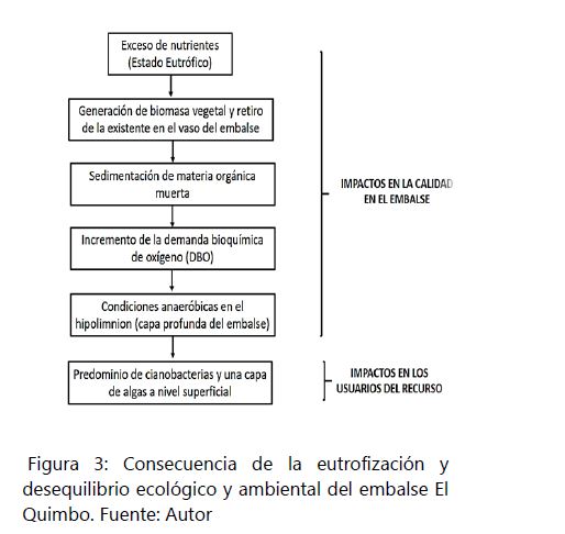 Luego CEPIS (2001), nos indica que la principal consecuencia de la eutrofización es el desequilibrio ecológico del embalse El Quimbo (Figura 3), la cual se supone una ocurrencia de otros impactos ambientales tanto dentro del vaso del embalse como sobre los usuarios del recurso hídrico, aguas abajo de la presa. Los impactos más relevantes son: