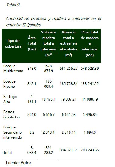 Las reservas de nutrientes producidas en el área de inundación del embalse el Quimbo están asociadas con la vegetación y están representadas por la biomasa superficial, madera, raíces y suelos. Al igual que para la escorrentía superficial, a partir del mapa de uso actual de la tierra generado por el IGAC (1994) e INGETEC (2008), se determinan las superficies con sus respectivos porcentajes, del tipo de cobertura vegetal existente en el área de inundación (Tabla 9).