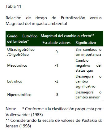 El cálculo de la magnitud de impacto ambiental está representada por el riesgo de eutrofización, tanto para el llenado como para la operación del embalse, se procedió a la considerar la escala propuesta por Pastakia & Jensen (1998) en la cuantificación de este criterio de Estudios de Impacto Ambiental (EIA), que se describe en la Tabla 11 que define cuál es la magnitud del riesgo de eutrofización del embalse y estima la futura intensidad del detrimento en la calidad del agua del embalse.