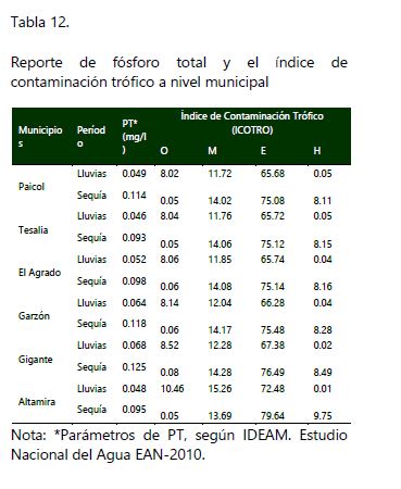 Con los registros de fósforo total (PT) tomados en los afluentes tributarios de los seis (6) municipios ubicados en la zona de influencia del embalse El Quimbo se define que la condición predominante para el período de sequía donde el Índice de Contaminación Trófico es EUTROFICO (E) que se ubica en la cota máxima (720 msnm – Aportes de los municipios de Paicol, Tesalia y El Agrado) y cota normal (710 msnm – Aportes de los municipios de Gigante, Garzón y Altamira), lo que nos indica que es un embalse rico en nutrientes para organismos productores, la parte superior presenta altos niveles de oxígeno, aportado por algas, pero su parte inferior es bastante deficiente en oxígeno (Tabla 12).