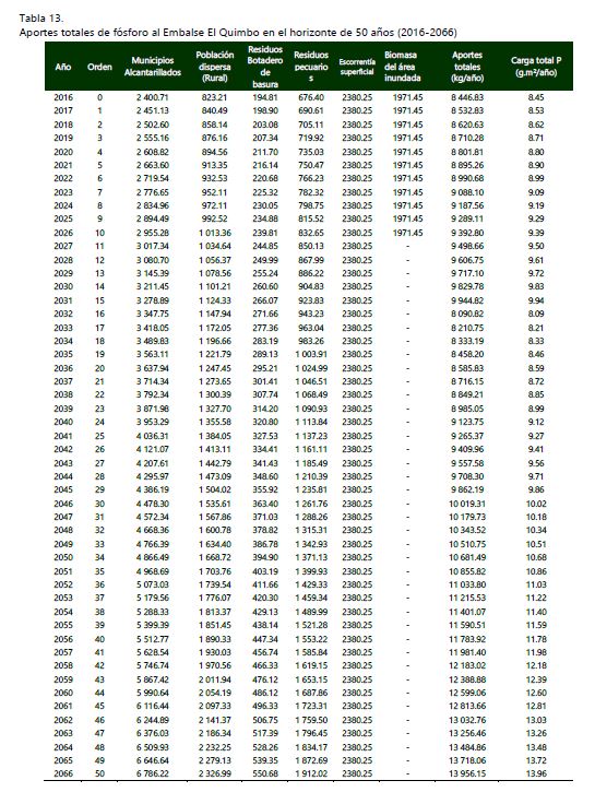 El 50% del aporte total de fósforo (P) estimado para cada año está disponible en cada período simulado de un (1) año, partiendo desde el año 2016 (año en que entro en operación, estando lleno el embalse.