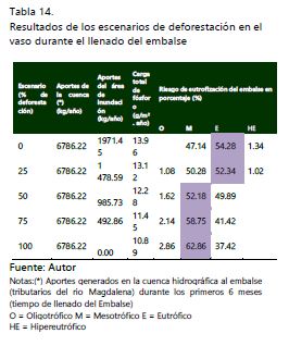 El factor de carga de cada una de las fuentes aportantes de fósforo al embalse El Quimbo, se obtiene que, para el horizonte de tiempo de 50 años (vida útil del proyecto hidroeléctrico), contados a partir del 2016 (fase de llenado del embalse) hasta el 2066 (vida útil del embalse), el principal aporte proviene de las aguas de escorrentía superficial, seguido de las aguas residuales de los municipios (alcantarillados del área urbana y rural), luego la biomasa del área de inundación que no se retiró del vaso del embalse, como se describe en la Tabla 13. Basado en lo anterior, se consideraron cinco (5) escenarios de deforestación del área de inundación (Tabla 14) donde el riesgo de eutrofización se incrementó a medida que aumenta el porcentaje de deforestación, como la descomposición de la biomasa no retirada del área del embalse, pasa de estado eutrófico (E) para 0% de deforestación a estado mesotrófico (M) para 100% de deforestación, es decir, de un nivel de alta productividad con bajas concentraciones de oxígeno y altas concentraciones de nutrientes a un nivel de media productividad.