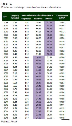 La predicción del riesgo está proyectada a 30 años, según la metodología del RAS 2000 (vida útil de los sistemas de aguas residuales de los municipios), donde se ha considerado los primeros 10 años de la etapa de operación que presenta una condición eutrófica (Tabla 15).