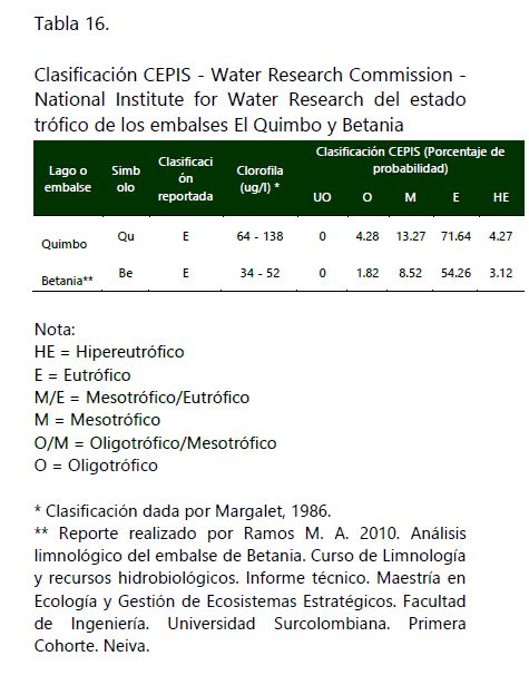 Para el embalse El Quimbo se aplica la clasificación del estado trófico, tomando como referencia CEPIS y Water Research Commission y National Institute for Water Research, dando una condición eutrófica (E) con un rango variable de clorofila, metodología similar al que se aplicó por Ramos (2010) al embalse de Betania (Tabla 16).