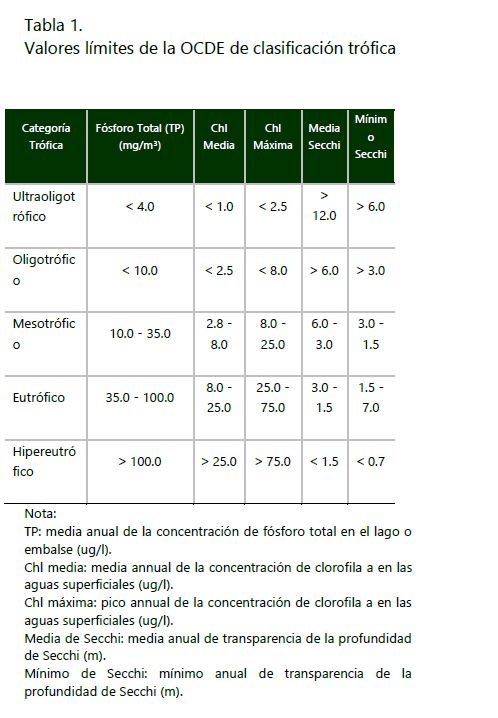 La Organización para la Cooperación y el Desarrollo Económico (OCDE, 1982) adelantó investigaciones sobre las relaciones cuantitativas de nutrientes y la eutrofización ocasionada por estas cargas en lagos y embalses; una de las clasificaciones (Janus y Vollenweider, 1981; OCDE, 1982) que propusieron para determinar los diferentes estados tróficos se basa en variables de fácil medición (Beltran y Rangel, 2012-2013). Otro método para evaluar el estado trófico es el índice de Carlson (1996), que utiliza como variables los valores medios anuales de la profundidad de visión del disco de Secchi y de las concentraciones superficiales de TP y de clorofila 'a'.