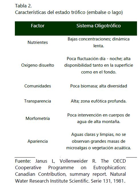 Los dos extremos de productividad determinan un sistema oligotrófico de un lado con baja productividad y de otro lado el sistema eutrófico que demuestra las características de una mayor productividad y concentración de nutrientes como ocurre en un embalse con estas características (Janus, 198) (Tabla 2).