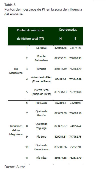 En la Tabla 3 se describen los 11 puntos de muestreos para el fósforo total (PT) (realizados en los meses de julio y noviembre de 2016, durante los períodos de sequía y de lluvias), los cuales fueron definidos en el Estudio de Impacto Ambiental realizado por INGETEC (2008), que son los puntos de vertimientos y toma de parámetros de calidad de agua.