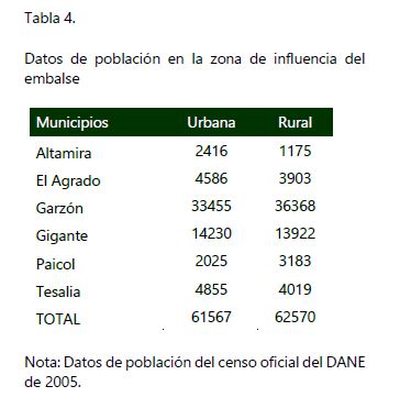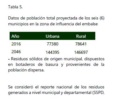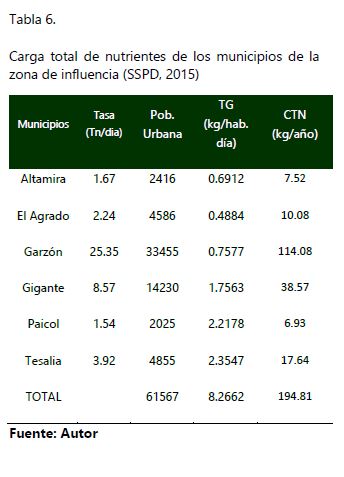 Se utilizaron los datos de población urbana y rural o población dispersa, y una tasa de producción de residuos sólidos de 8.266 kg / hab.día (definida para el Huila por parte de la SSPD), para establecer los aportes de nutrientes producidos en los seis (6) municipios de la zona de influencia del embalse El Quimbo.