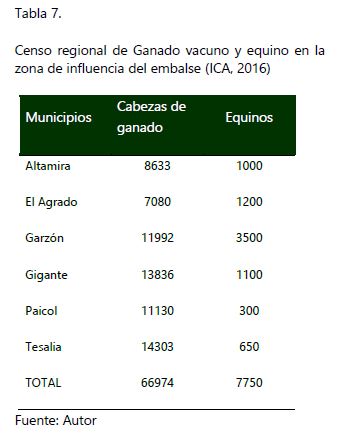 La carga total de residuos de producción pecuaria se ha estimado en un 12.4.8% que llega al embalse. El ICA (2016) reporta 66974 cabezas de ganado vacuno y 7750 cabezas de equinos dentro y fuera del área del embalse El Quimbo (Tabla 7).