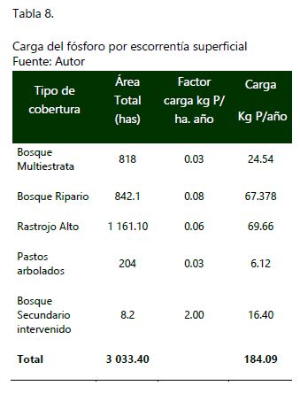 El aporte total del fitonutriente se obtiene multiplicando la superficie (ha) por el factor de carga (kg/ha. año) para el tipo de cobertura considerado. Donde se estableció que el 100% de la carga de fósforo (P) que llega al embalse El Quimbo es de 184.09 Kg P/año (Tabla 8).