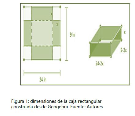 Una caja rectangular se fabrica con una pieza de cartón por 24 pulgadas de largo por 9 de ancho, de la cual se cortan cuadrados idénticos a partir de las cuatro esquinas y se doblan los lados hacia arriba, como se muestra en la Figura 1. Determine las dimensiones de la caja de volumen máximo ¿Cuál es este volumen? (Purcell, Varberg, Rigdon, 2007, p. 167; modificado de Granville, 2017, p. 72).