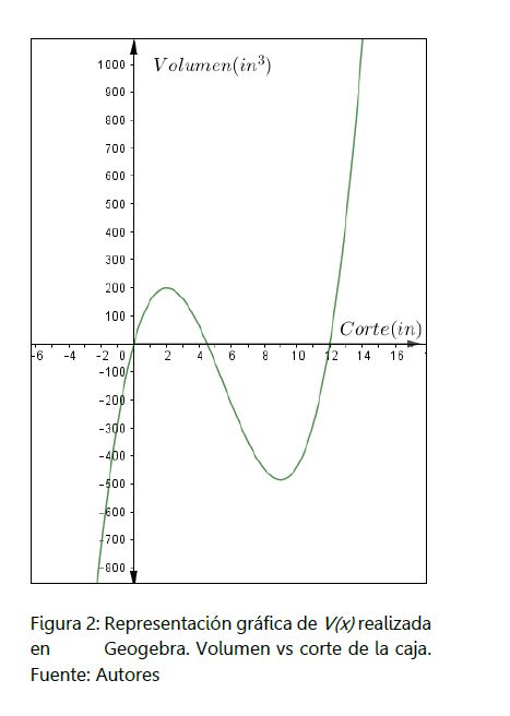 La ecuación (2) es una función cúbica que representa el volumen de la caja en función del corte cuadrado realizado a la lámina rectangular. Su representación gráfica se muestra en la Figura 2.
