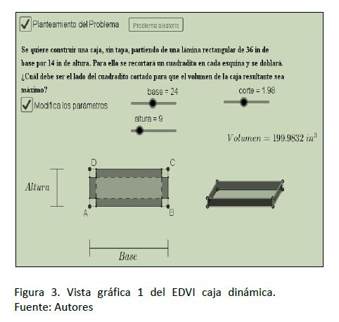 Como un resultado del taller, se construyó un EV compuesto de dos vistas gráficas. La vista gráfica 1, muestra la imagen de la lámina y su respectiva transformación en una caja sin tapa (Figura 3). Por medio de los deslizadores “base y altura” se cambia de forma dinámica los parámetros que definen la lámina rectangular, de modo que se pueda ajustar a diferentes valores según sea redactado el problema.