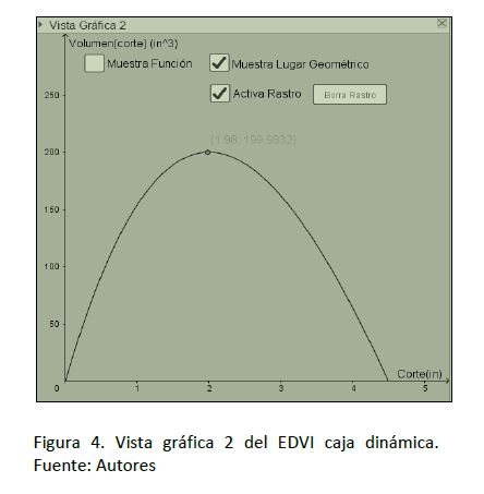 Al mover el deslizador “corte” se simula una familia de cajas de manera dinámica, de modo que en la vista gráfica 2 (Figura 4), se aprecia el rastro o lugar geométrico que marca el punto con coordenadas (corte, volumen) que representa el volumen de la caja para determinado corte.