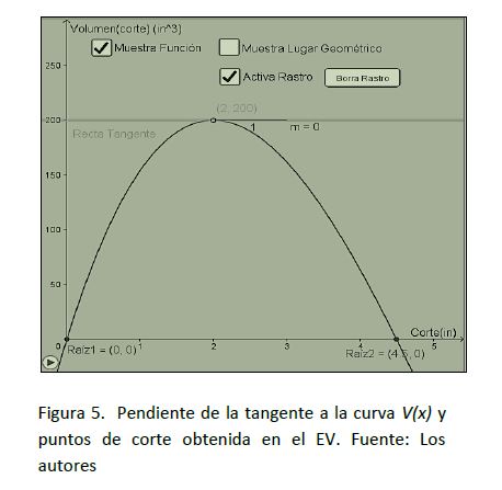 En este caso mediante la construcción del EV, se propuso trazar la recta tangente a la función hallada V(x), y observar dinámicamente que, para un máximo del volumen, el valor de la pendiente de dicha recta tangente es igual a cero (de ahí el criterio), así como el dominio de la función es válido para valores acotados por las raíces (Figura 5).