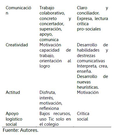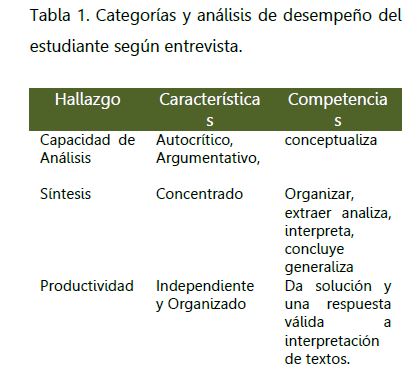 Realizada una entrevista a estudiantes de los profesores sobre la estrategia implementada para su aprendizaje, permitió determinar categorías en torno al desempeño con características (Tabla 1).