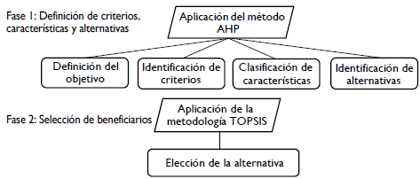 La metodología utilizada se presenta en la figura 2. Esta se estableció en dos fases: una de definición de los criterios, características y alternativas por considerar; y otra de selección de los beneficiarios del banco. La primera comprende la aplicación del método AHP. La segunda, la aplicación de la metodología TOPSIS. La fase 1 podría considerarse estratégica. La fase 2, táctica.