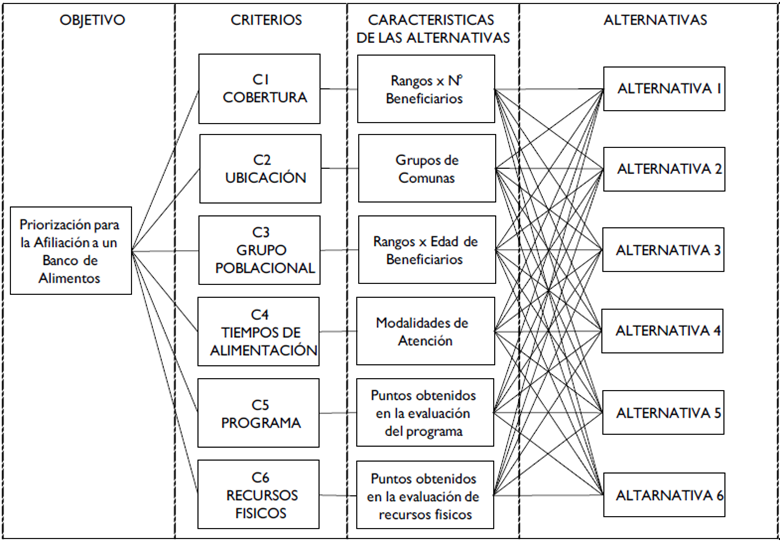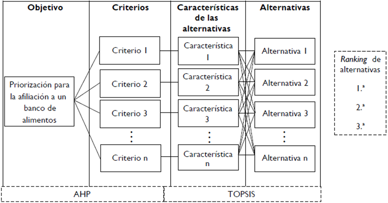 En la figura 3, se puede observar la estructura general que se propone para aplicar la metodología AHP-TOPSIS en un banco de alimentos. Primero, usando el AHP, se definen el objetivo, los criterios y su ponderación. Después, usando la TOPSIS, se establecen las características que se evaluarán de cada una de las alternativas y, finalmente, se elabora un ranking de alternativas. Las líneas que relacionan las características con las alternativas indican que todas las alternativas serán evaluadas considerando todas las características definidas.