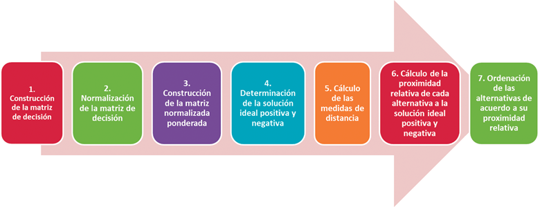 Una vez identificados los criterios y sus pesos, así como las alternativas y sus características, se debe establecer su priorización para decidir así cuáles serán las organizaciones que el banco va a afiliar. Para esto, se deben seguir los pasos de la metodología TOPSIS, que se presentan en la figura 4.
