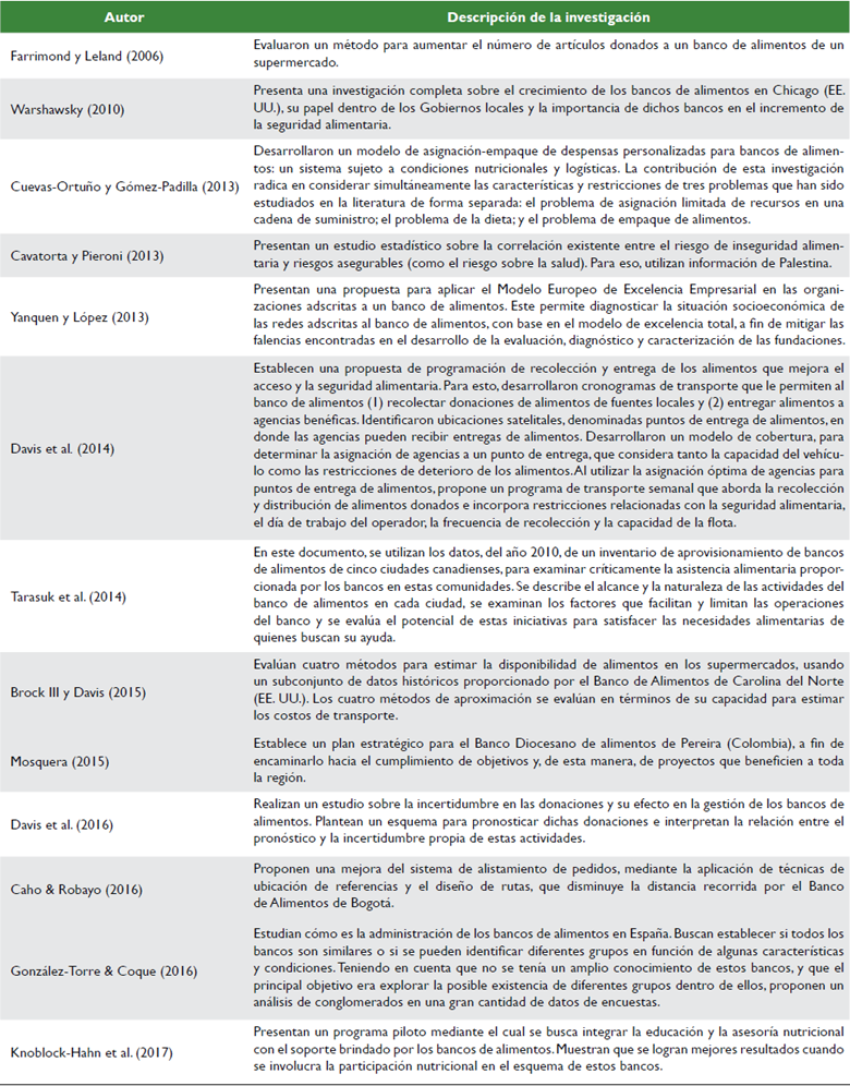 En la actualidad, existen investigaciones encaminadas al análisis y mejoramiento del desempeño de las funciones de los bancos de alimentos, algunas de carácter cualitativo y otras de carácter cuantitativo. Estas estudian aspectos relacionados con la recolección de los alimentos, las operaciones internas del banco y la distribución de estos. En la tabla 1, se presentan algunos de los trabajos de diferentes autores durante los últimos diez años, que fueron hallados en bases de datos tales como Science Direct, Emerald, Ebsco.