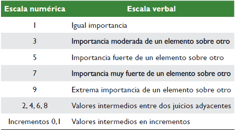 Esto se logra utilizando la estrategia propia del AHP de asignación directa, por la que cada unidad decisora solo realiza una valoración sobre la importancia del criterio, verbalizada en términos cualitativos, y, después, se acude a una escala previamente establecida, con lo cual se obtienen los valores numéricos correspondientes a su valoración. La escala utilizada es la sugerida por Saaty (2011), que se presenta en la tabla 2.