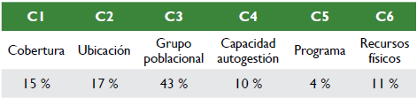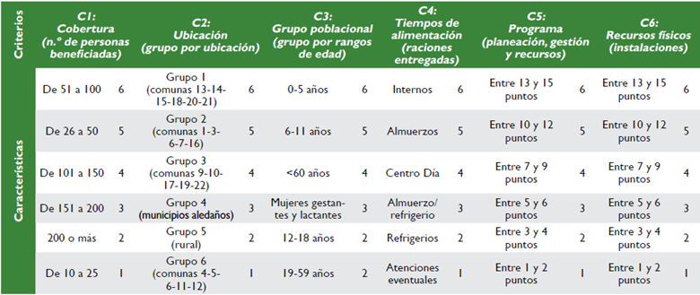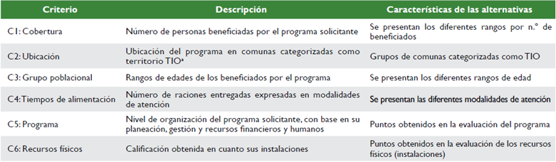 Como se evidencia en la tabla 3, los criterios 5 y 6 (programa y recursos físicos) reúnen varios factores cualitativos que son importantes y que se evaluaron en el momento de la visita de verificación. El equipo asignó un puntaje para su estimación numérica por las particularidades de cada alternativa. En el caso de la evaluación del criterio 5 (programa), se tuvieron en cuenta variables de organización como la clara definición del tipo de atención, el tiempo de funcionamiento, la definición de la misión, la visión y los objetivos, así como la forma de financiamiento y los recursos humanos disponibles. Se fijó un total de 15 puntos para aceptar el cumplimiento ideal del criterio. Para el criterio 6 (recursos físicos), se tuvieron en cuenta variables como el tipo de instalaciones, el menaje, la cadena de frío y de calor y el abastecimiento de servicios públicos. Se asignó también un total de 15 puntos para aceptar el cumplimiento ideal del criterio.