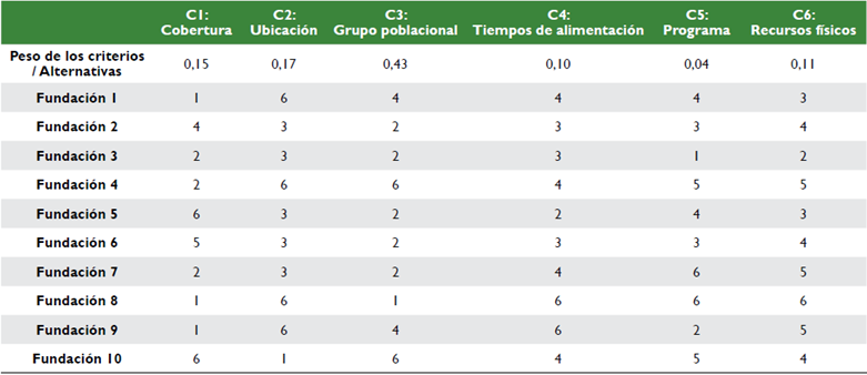 Con base en la escala de valoración, se calificaron las características de cada una de las fundaciones o programas sociales solicitantes, según los criterios definidos. Luego, se procedió a aplicar la metodología TOPSIS, para así definir la escala priorizada de afiliación de dichos programas. Cada fundación solicitante presenta unas características especiales que son evaluadas según el peso de importancia de los criterios definidos. Esto hace que sea más o menos prioritaria la afiliación de una fundación en comparación con las demás. La matriz de decisión, en donde se encuentra la valoración de cada característica para cada alternativa, se presenta en la tabla 7.