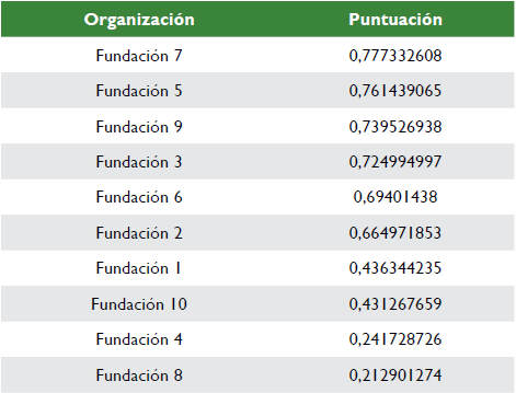 Una vez que se ha efectuado cada uno de estos pasos, se obtiene la ordenación de las alternativas, según la proximidad relativa. Es decir, se obtiene la priorización de las organizaciones que serán afiliadas al banco. Este resultado es un ranking para seleccionarlas. El descripción detallada de la aplicación de TOPSIS se puede consultar en Ishizaka y Nemery (2013).