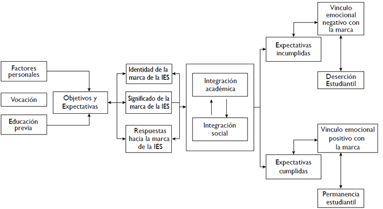 Teniendo presente lo anterior, el aspirante toma la decisión de ingresar a la institución y una vez dentro, el ahora estudiante se ve inmerso en la integración académica y social que propone Tinto (1987), en donde las interacciones con docentes y compañeros, así como el rendimiento académico y las actividades extracurriculares (generalmente asociadas al bienestar universitario), tienen un papel importante en el cumplimiento o no de las expectativas previas retroalimentando las tres fases del modelo brand equity basado en el consumidor, ya mencionadas, fortaleciéndolas o debilitándolas.