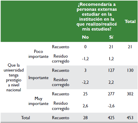 La tabla 1 presenta las diferencias estadísticas en términos de las frecuencias de las variables de interés (p = 0,05); es decir, se identifica que hay más personas que recomendarían a terceros la universidad en la que estudian, considerando importante el prestigio que tiene la universidad a nivel nacional.