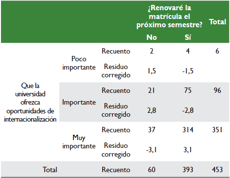 Para la dimensión significado, se obtuvieron los resultados de la tabla 2, la cual cruza las variables intención de permanencia y la existencia de programas de internacionalización. Puede apreciarse que hay una mayor cantidad de personas que consideran muy importante la existencia de oportunidades de internacionalización con la intención de renovar la matrícula el próximo semestre; lo que puede indicar que el comportamiento de las variables no corresponde a aspectos aleatorios. De esta manera, se identifica que probablemente este es el elemento de la marca que más aportaría a la permanencia estudiantil y (como se vio anteriormente) a la resonancia de marca, confirmando así la hipótesis de este estudio