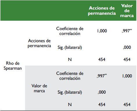 Para estudiar la asociación entre los factores 1 y 2 de la escala, estos se correlacionaron utilizando una correlación de Spearman y con este coeficiente se obtuvo una correlación de 0,997 (véase tabla 3), lo que indica que hay una fuerte asociación entre las variables acciones de permanencia y valor de marca.
