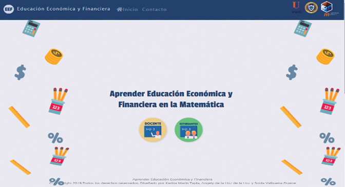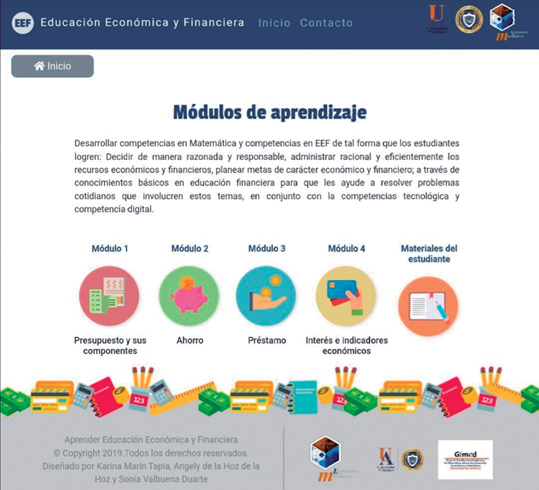 El recurso educativo digital (RED), diseñado y utilizado para la organización y ejecución del programa de formación docente, fue creado bajo la licencia Creative Commons. Es alojado en eef-ua.herokuapp.com, es gratuito y accesible para todo público, y se llama Aprendamos educación económica y financiera en la matemática. También cuenta con orientaciones pedagógicas para el docente y el desarrollo de las actividades dirigidas a estudiantes (Figura 2).