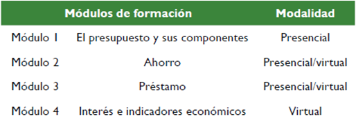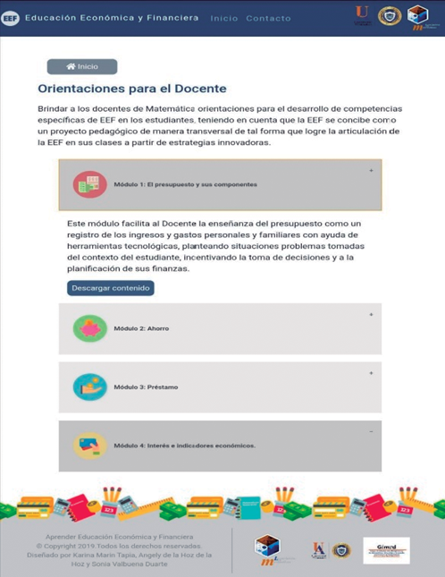 En el RED se crearon cuatro módulos de formación, los cuales cuentan con objetivos, desarrollo de contenidos económicos y financieros, estrategias didácticas, competencias en EEF. En el espacio del docente, se encuentra el objetivo del programa y los cuatro módulos de formación; cada módulo cuenta con la descripción de este y el contenido descargable en el que se halla la planeación de las actividades brindadas en un archivo PDF (Figura 3).