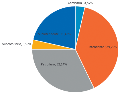Según el trabajo de campo realizado, fue posible identificar que, para el caso de los policías profesionales adjuntos a la ESBO, el mayor número se concentra en los intendentes, con un 39,29 %, seguido de los patrulleros con un 32,14 %, subintendentes con un 21,43 % y, en una misma frecuencia, en los comisarios y subcomisarios con un 3,57. %. La figura 2 detalla esta información.