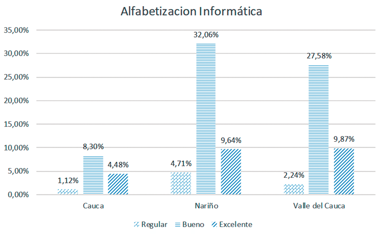 En cuanto a la variable de Alfabetización informática, se observa que el conocimiento que dicen tener tanto estudiantes como policías profesionales no es consistente entre regiones. Así es que, por ejemplo, en el departamento de Nariño, el 32,06 % de los individuos manifiestan tener conocimientos buenos sobre las nuevas tecnologías, mientras que en el departamento del Cauca solo el 8,30 % manifestaron lo mismo.