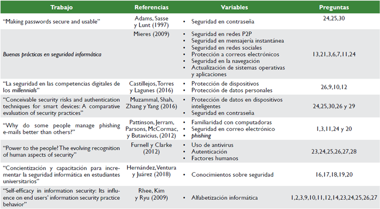 A continuación, se reseñan los principales documentos de referencia que sirvieron para la planificación y el desarrollo de la investigación, particularmente desde el componente metodológico en la medida en que cada trabajo revisado sirvió para la identificación de diferentes variables y, por tanto, la formulación de las diferentes preguntas que fueron incluidas en el instrumento de recolección de información. La tabla 1 presenta el insumo utilizado para la identificación de cada una de las variables estudiadas durante la investigación.