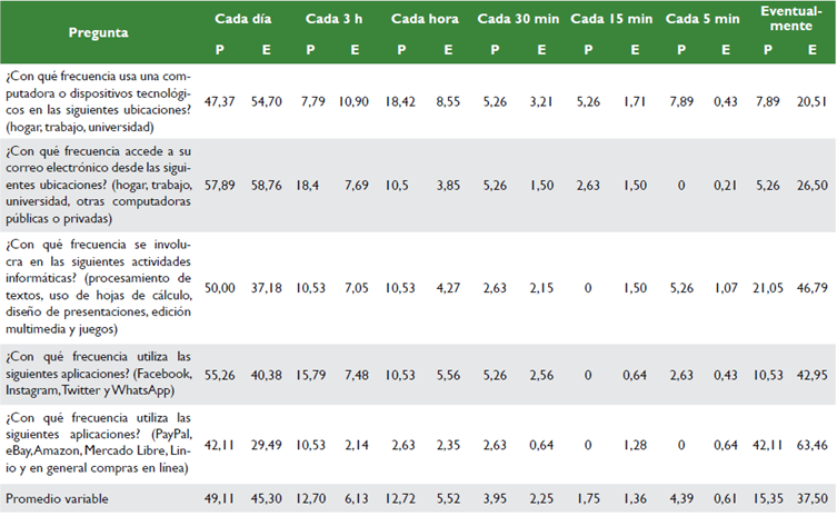En cuanto a policías profesionales, el 47,37 % de ellos cada día usa dispositivos tecnológicos, mientras que los estudiantes en esa misma frecuencia alcanzan el 54,70 %. Lo anterior coincide con el aumento del uso de estas tecnologías según lo mencionado en acápites anteriores. Por otro lado, se encuentra que tanto policías como estudiantes usan estas tecnologías en mayor grado para comunicarse por medio de redes sociales tales como Facebook, Instagram, Twitter y WhatsApp. Paralelamente, causa curiosidad que, para la pregunta sobre la frecuencia de compras en línea, para el caso de profesionales, el 42,11 % de ellos indiquen que cada día realiza ese tipo de transacciones; quizá para esta subvariable se debió utilizar otro tipo de escala de valoración, ya que una persona natural a menos que tenga una actividad económica especial, no realiza tal número de transacciones. De hecho, en Portafolio (2019) se menciona "que solo el 39 % de las transacciones se realizaron a través de dispositivos móviles el año pasado". Además, Deloitte (2017) señala que el 62 % de los usuarios con dispositivo móviles no lo usan para comprar en línea, lo cual coincide con el 63,46 % de estudiantes del programa técnico que eventualmente compran por dispositivos tecnológicos. La tabla 3 expone los resultados tanto para policías profesionales (P) como estudiantes (E).