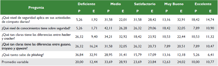 En la tabla 5, se puede apreciar que un 49,13 % y un 50,36 % de profesionales (P) y estudiantes (E), respectivamente, presentan buenas prácticas en cuanto a la conciencia del manejo de la seguridad. Sin embargo, al confrontar estos datos versus el pensum académico de la ESBOL donde se ve un módulo de seguridad de la información, se observa que solo la mitad de los estudiantes tienen conciencia sobre la seguridad informática, lo cual invita a realizar un análisis sobre qué sucede con la otra mitad del estudiantado y, por supuesto, con el personal profesional adjunto al centro de formación. Lo anterior para dotar de herramientas a todo el personal en la medida en que el 47,83 % de todos los individuos que participaron de esta investigación manifestaron que los datos que almacenan en sus dispositivos tienen una sensibilidad alta o muy alta, y el 30,63 % utiliza conexiones directas tipo peer-to-peer para intercambiar archivos tales como películas y juegos.